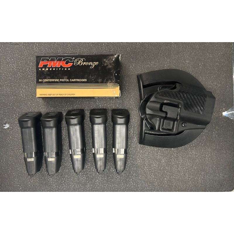 Includes 6 Magazines, OWB RH Holster, 50 rounds of FMJ ammo, Unfired