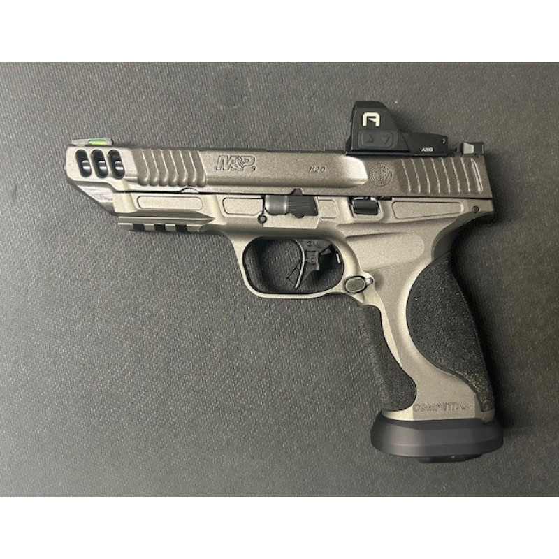 S&W M&P M2.0 Competitor has a metal frame design. The pistol features an optics ready slide; slide lightening cuts on top and sides; optimal 18-degree grip angle for natural point of aim; flat faced trigger; oversized and reversible magazine release; fiber optic front sight and blacked-out rear sight; textured polymer front strap; flared mag well for fast reloads; enhanced sear for lighter, crisper trigger let-off; Picatinny-style rail; low barrel bore axis makes the M&P pistol comfortable to shoot, reducing muzzle rise and allowing for faster aim recovery; M&Ps patented take-down lever and sear deactivation systems allow for disassembly without pulling the trigger. Includes four interchangeable palmswell grip inserts and four magazines.