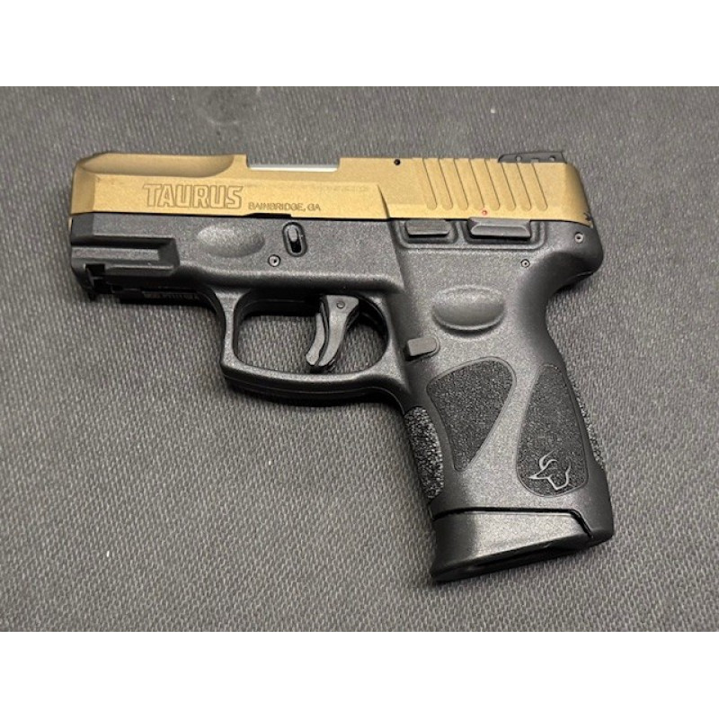 This Taurus PT111 G2 is a right-hand semi-auto pistol in 9MM Luger Cal. The barrel is 3.5 inches long. It has rear cocking serrations and a bottom accessory rail. It has a Three Dot Sight System, a fixed bar with one white dot front sight, a fixed notch - broken - with one white dot rear sight. The pistol grip side panels are textured metal with a thumb and finger rest. The front and back straps are textured metal.