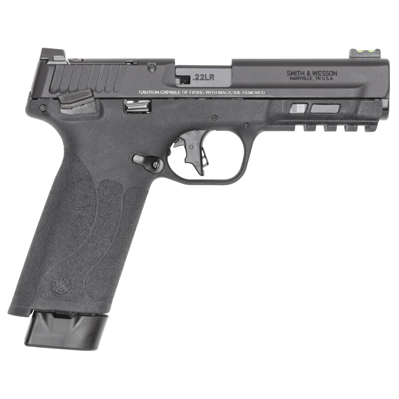The M&P22X designed with superior ergonomics in mind, it offers a slim grip, low recoil and a crisp, hammer-fired trigger for a superior shooting experience. Optics ready; Picatinny rail; reversible magazine catch; ambidextrous manual thumb safety; blacked out serrated square notch rear sight, Hiviz LiteWave H3 fiber optic front sight. Includes 1/2"x28 suppressor thread adapter, wrench and two magazines.